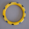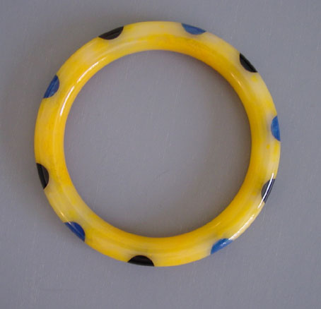 SHULTZ bakelite yellow swirl spacer bangle with 10 black and dark denim blue colored dotsProduct #33245 All items in excellent vintage condition unless otherwise noted.