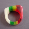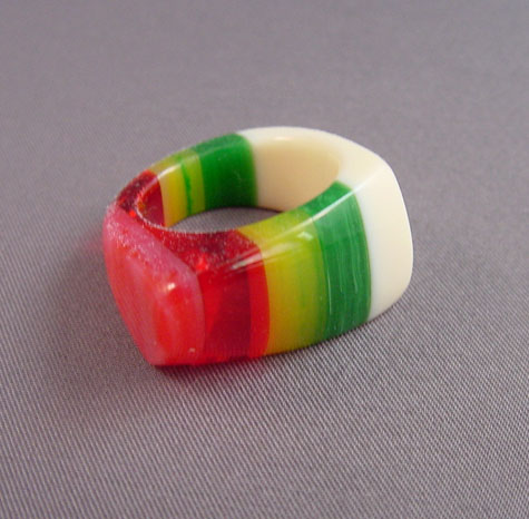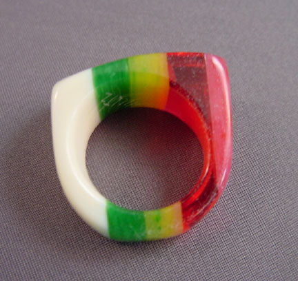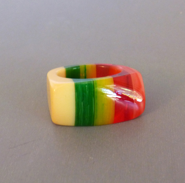 Description SHULTZ cream colored bakelite ring with stripes of rose, transparent red, marbled yellow and green, size 7-3/4. Made about 2005, it is signed on the inside "Shultz". View View Product #33790
