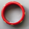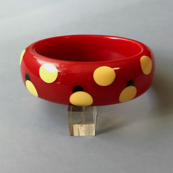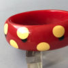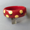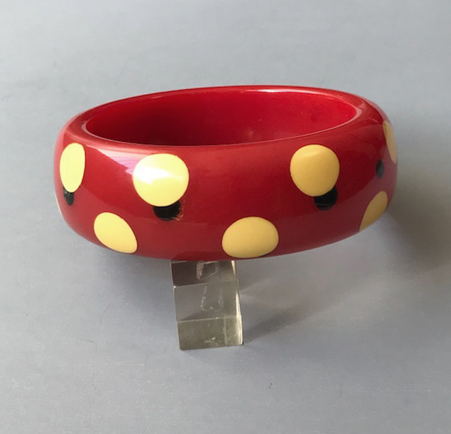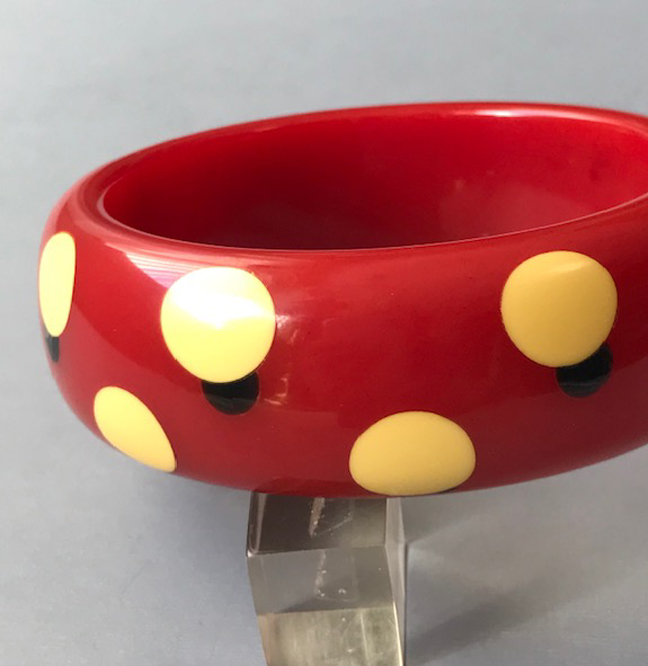SHULTZ delicious apple red bangle with cream and blue moon dotsShultz uses 1940s vintage bakelite material to make his jewelry, and this bangle was made prior to 2010. View View View Product #B65234 All items in excellent vintage condition unless otherwise noted.