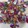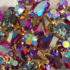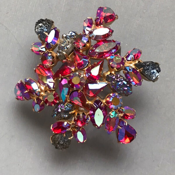 STAR shaped very special brooch with brilliant red, aqua and plum aurora borealis and textured blue rhinestones