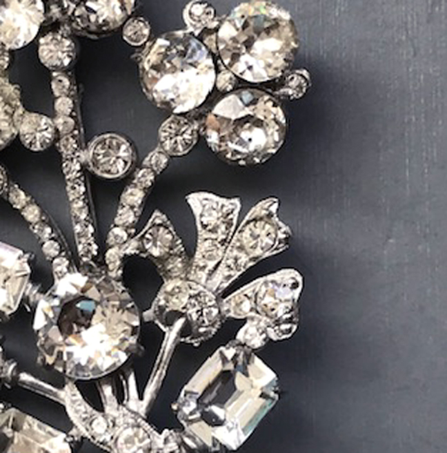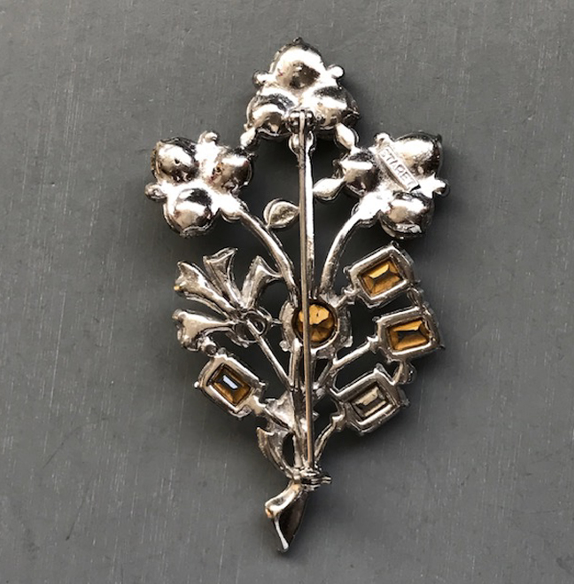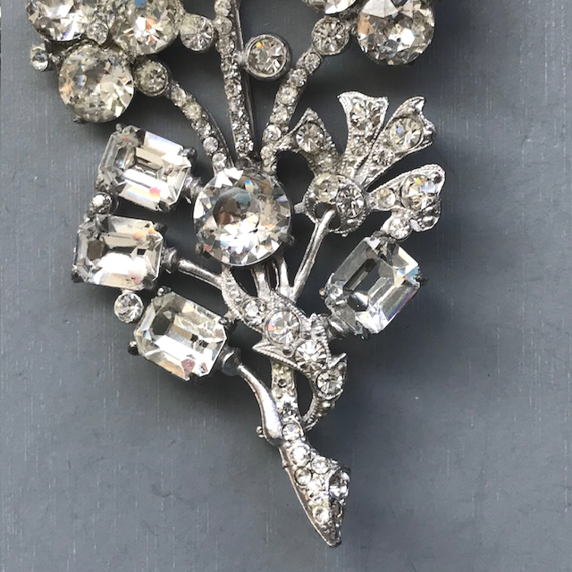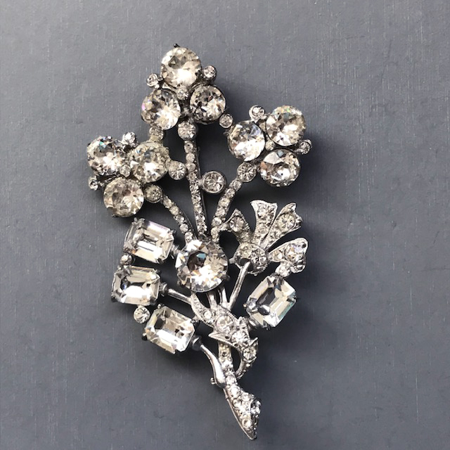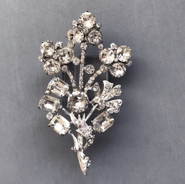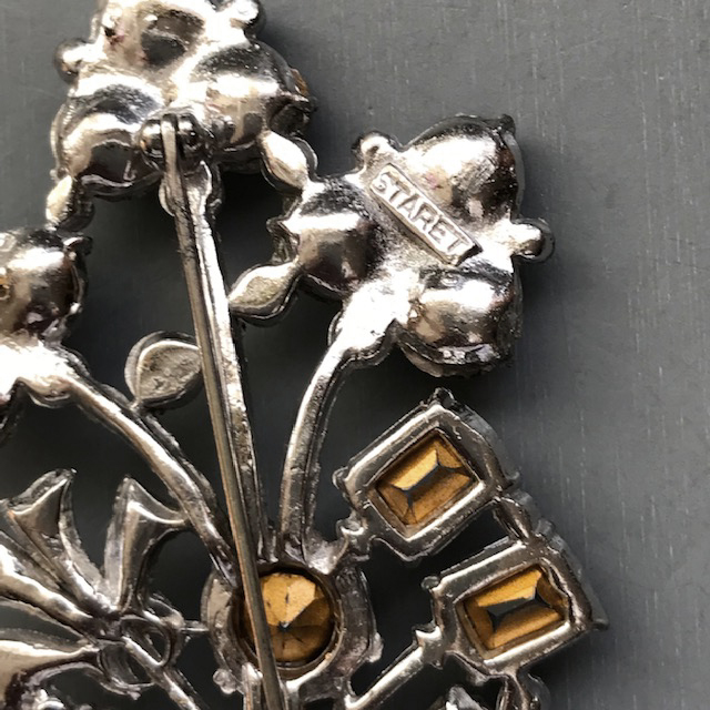 Description STARET clear rhinestone flower bouquet brooch in a silver plated setting, circa 1940. It is signed "Staret" on the back and it is 3-1/4" by 2". The emerald cut larger stones are really brilliant! STARET jewelry was made for a brief period from about 1940-1947, and they were located in Chicago. There have always been rumors that they were affiliated with Eisenberg, but this has been denied by Karl Eisenberg. Staret pieces are generally on the large side, and the settings are sometimes enameled with rhinestones. There is not a gray stone in this pin, they are all dazzling! ViewViewViewViewView Product #42669