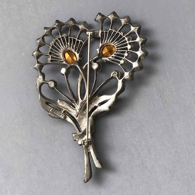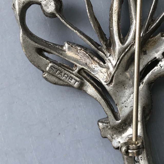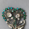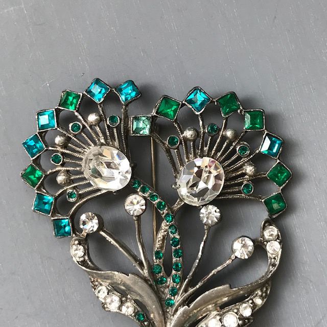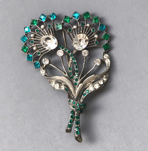 STARET Deco style double flower brooch with square green and aqua rhinestones and clear rhinestone accentsProduct #S12087 All items in excellent vintage condition unless otherwise noted.