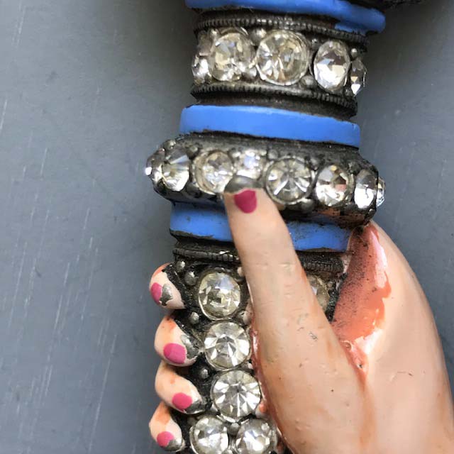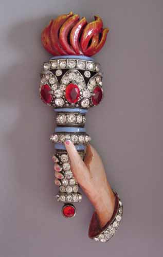 DescriptionSTARET GENUINE 1940s torch brooch, an iconic and patriotic brooch with red and clear rhinestones and blue, red and flesh pink enamel, genuine and made in the 1940s, 4-1/8". The only flaw is a tiny bit of enamel missing at the tips of the fingers if you turn the brooch just right so you can see it, and it can be seen in the last magnified photo, amazing for an 80-year-old brooch.