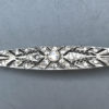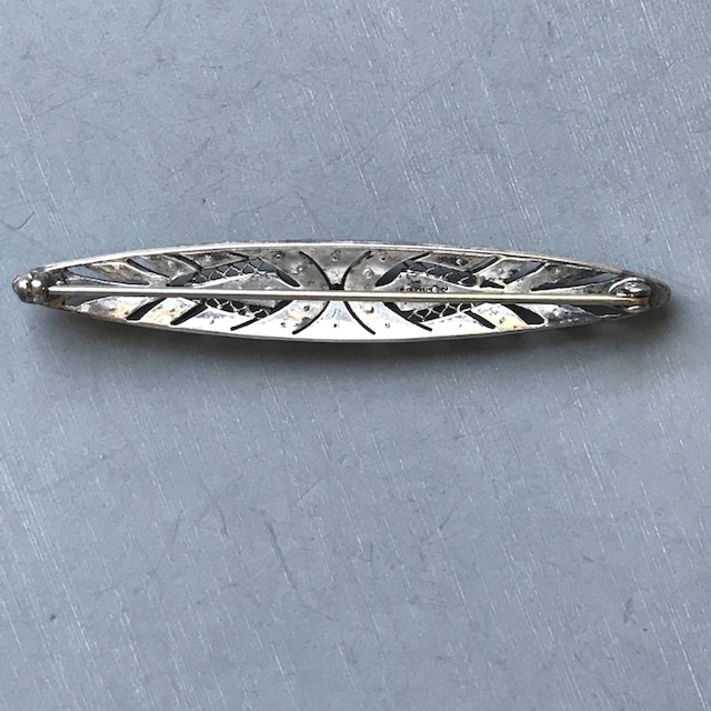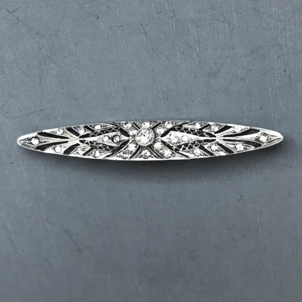 DescriptionSTERLING and clear delicate rhinestones filigree bar pin with a pierced filigree wire design, 2-1/2". The pierced design is lovely and this is from about 1920. View Product #Q26216