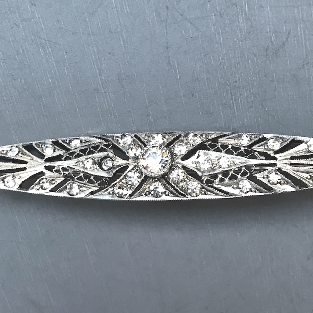 STERLING and clear rhinestone filigree bar pin with delicate wire work
