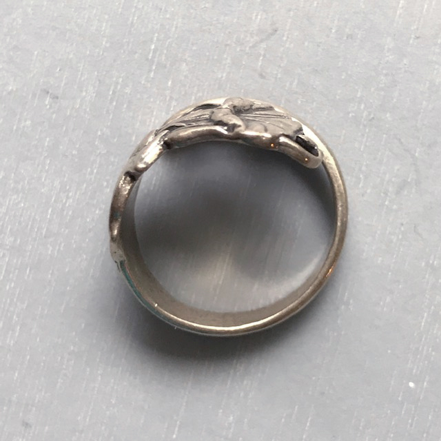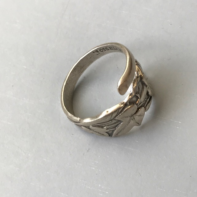Description STERLING sterling silver morning glory flower spoon ring, size 7-3/4 and overlapping so that it is adjustable, marked inside "silver 950", and it weighs .18 ounces. View View View View View View Product #41309
