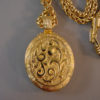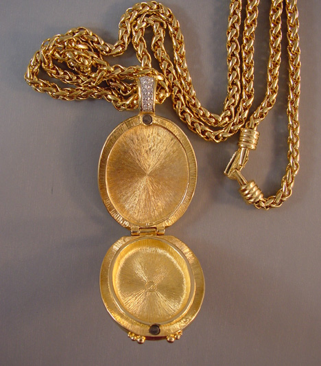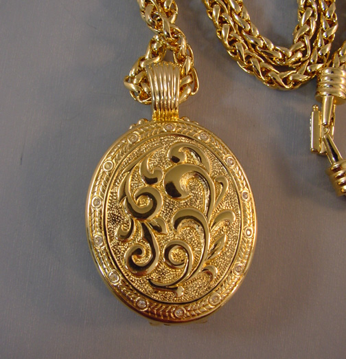 Description SWAROVSKI 1990s colorful locket pendant with brilliant rainbow of Swarovski crystal rhinestones in a hand polished gold plated finish.  The locket portion 1-3/4" by 1-1/3" and the Swarovski chain is 33" long.  The rainbow colors of the crystals are gorgeous and this is in excellent condition, circa 1990s.  It is one of my all-time favorite pieces from this company, and when you see it in person you will know why!  We have abundant information about Swarovski on our Swarovski reference page and more on our reference page about Swarovski Christmas jewelry as well as lots of photos on both pages.