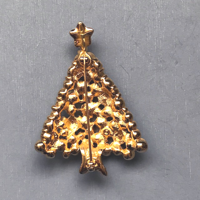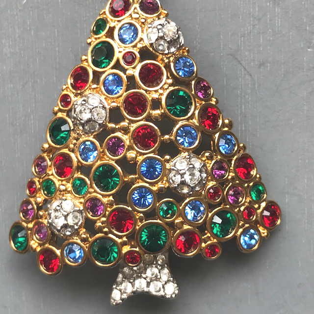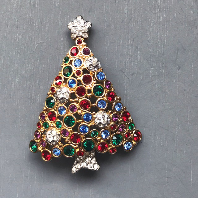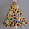 Description SWAROVSKI 1999 Christmas tree brooch with red, green and blue rhinestone boughs and clear rhinestone ornaments and a star on the top, all in a hand polished gold plated setting that is 2-1/4" by 1-1/2".  This piece can be seen in the book, "Christmas Tree Pins" by Kathy Flood on page 273.  It is marked on the back with the swan logo and copyright mark, and it is in excellent condition.