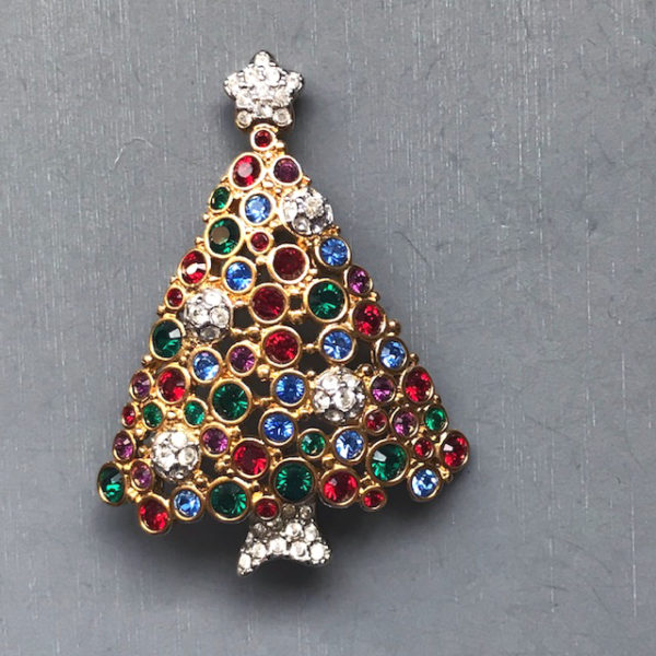 SWAROVSKI 1999 Christmas tree brooch with red, green and blue rhinestone boughs and clear rhinestone ornaments, boxed