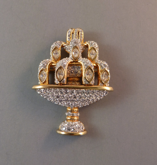 SWAROVSKI brooch of a garden water fountain with clear rhinestone paveA similarly designed 1930's diamond brooch can be seen in the book, "Warman's Jewelry" 2nd Edition by Christie Romero on page 121. It makes me wonder if Swarovski used that design as their inspiration for this piece. We have abundant information about Swarovski on our Swarovski reference page and more on our reference page about Swarovski Christmas jewelry as well as lots of photos on both pages. View Product #12049 All items in excellent vintage condition unless otherwise noted.