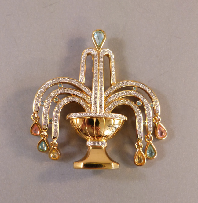 SWAROVSKI brooch of a garden water fountain with clear rhinestone water spray tipped by pastel colored dropsWe have abundant information about Swarovski on our Swarovski reference page and more on our reference page about Swarovski Christmas jewelry as well as lots of photos on both pages. View Product #38940 All items in excellent vintage condition unless otherwise noted.