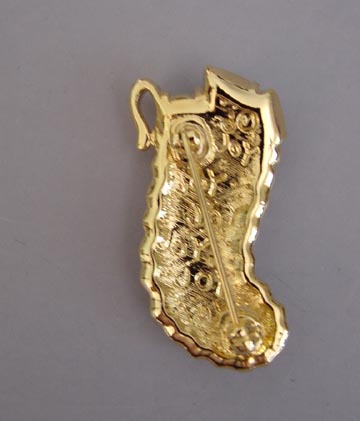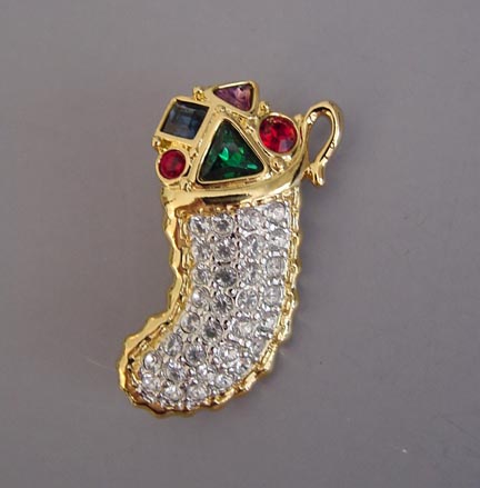 SWAROVSKI Christmas brilliant stocking brooch in clear, red, green and purple rhinestonesWe have abundant information about Swarovski jewelry on our Swarovski reference page and more on our reference page about Swarovski Christmas jewelry as well as lots of photos on both pages. Product #K64740 All items in excellent vintage condition unless otherwise noted.