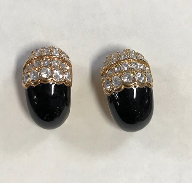SWAROVSKI earrings with brilliant clear crystals, black enamelingWe have abundant information about Swarovski jewelry on our Swarovski reference page and more on our reference page about Swarovski Christmas jewelry as well as lots of photos on both pages. View Product #33229 All items in excellent vintage condition unless otherwise noted.