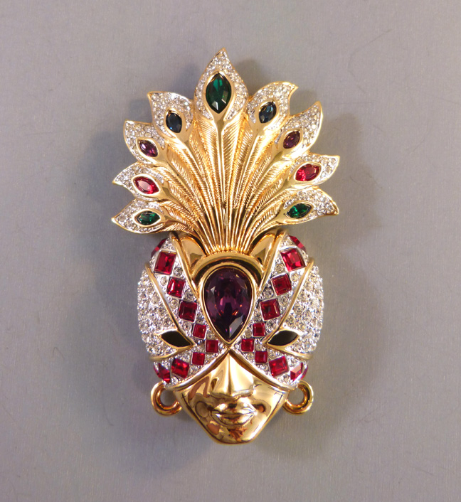 SWAROVSKI headdress and face figural brooch with a rainbowWe have abundant information about Swarovski jewelry on our Swarovski reference page and more on our reference page about Swarovski Christmas jewelry as well as lots of photos on both pages. View Product #K38899 All items in excellent vintage condition unless otherwise noted.