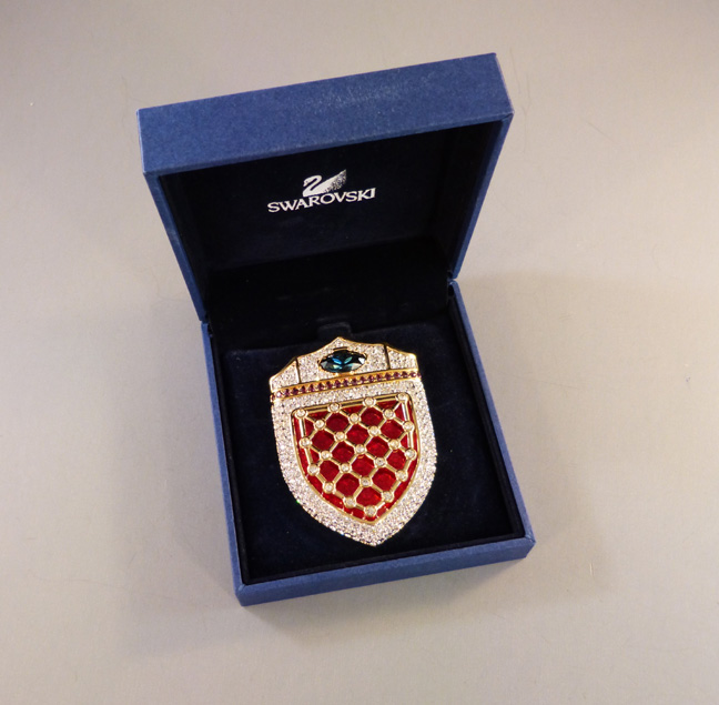 SWAROVSKI Limited Edition 300 Jeweler's Collection regal brooch with original boxSwarovski said of these, "Inspired by the heraldic motifs and pageantry of the Middle Ages, this brooch captures the majesty of the European Medieval Period. The Jeweled Shield has been meticulously handcrafted and adorned with Swarovski Austrian crystals in the deep jewel colors reminiscent of Gothic stained glass windows". We have abundant information about Swarovski jewelry on our Swarovski reference page and more on our reference page about Swarovski Christmas jewelry as well as lots of photos on both pages. View View Product #K38900 All items in excellent vintage condition unless otherwise noted.