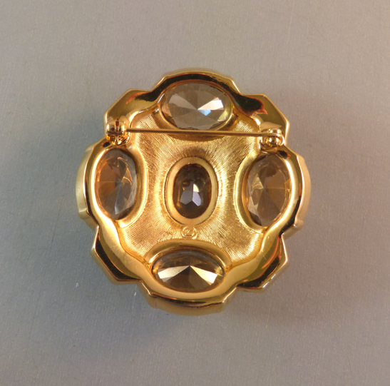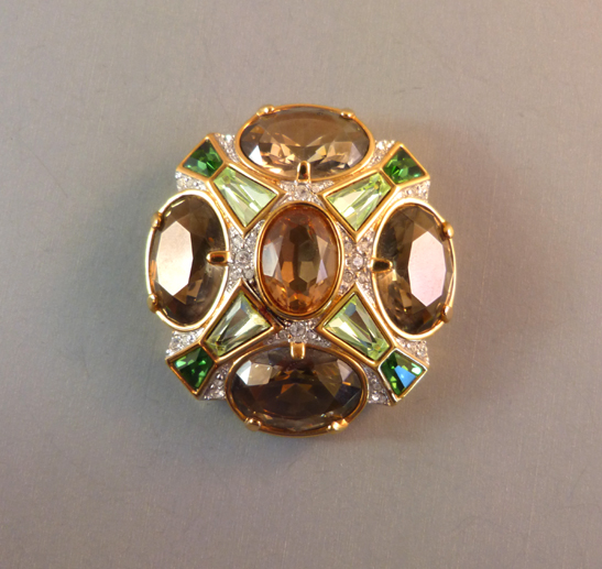 SWAROVSKI oval brooch in tan, topaz and celery green rhinestonesThe stones are brilliant and the setting in excellent condition, all the high quality expected from Swarovski jewelry. We have abundant information about Swarovski jewelry on our Swarovski reference page and more on our reference page about Swarovski Christmas jewelry as well as lots of photos on both pages. View Product #K38938 All items in excellent vintage condition unless otherwise noted.