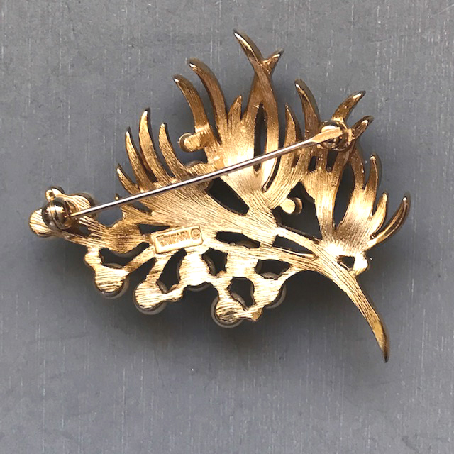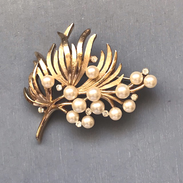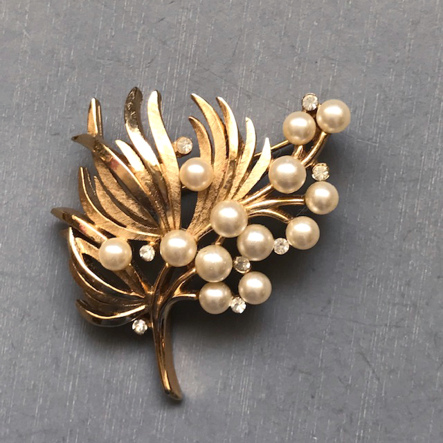 TRIFARI brooch, a golden branch with glass pearl berries and some clear rhinestone accentsProduct #42744 All items in excellent vintage condition unless otherwise noted.