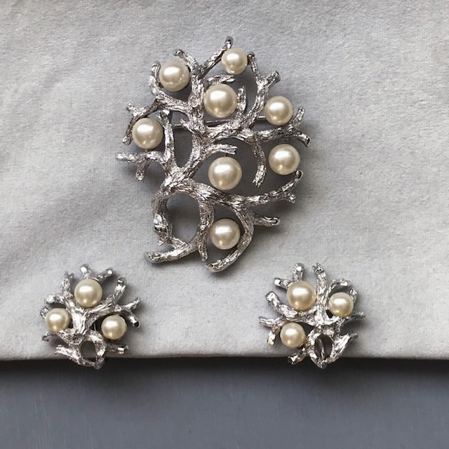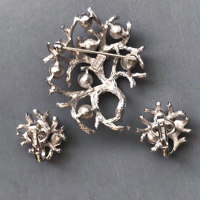 Description TRIFARI brooch and earrings made of glass pearls and a textured silver tone setting shaped like interesting branches.