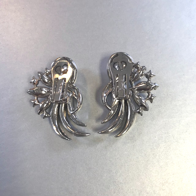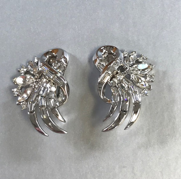 Description TRIFARI earrings with clear baguette, marquis and chaton rhinestones in a silver rhodium plated setting, clip backs 1-1/3". View Product #40995