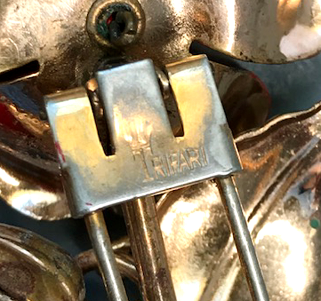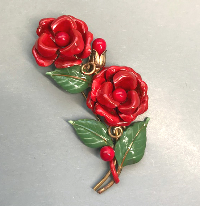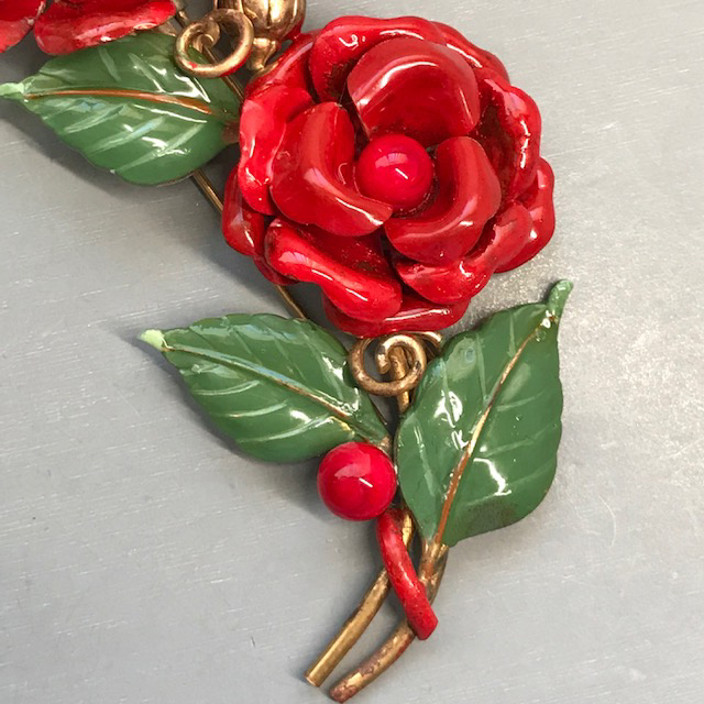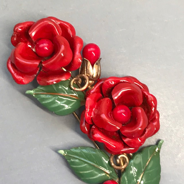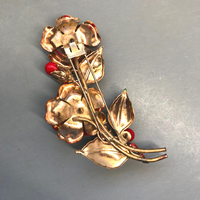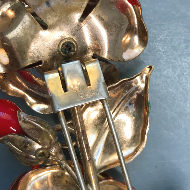 DescriptionTRIFARI fur clip with red enameled flowers and green leaves in a gold tone setting. The beautifully cupped flower petals and leaves with curved edges add a nice dimension to the clips. There are red glass beads in the center of the flowers as well as on the sides. Signed "Trifari" with the crown on the back, made in 1941 and it is 4" by 2". View View View View View Product #43065