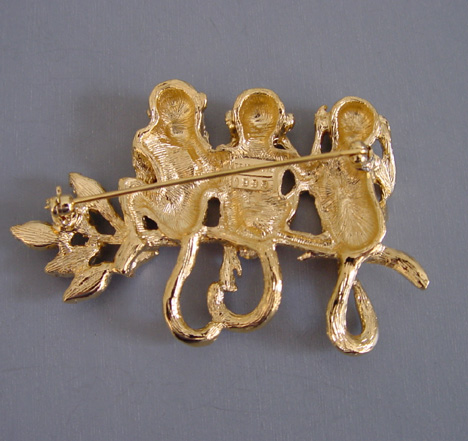 TRIFARI Jewels 1996 monkeys brooch with green, brown and blue rhinestonesProduct #X61619 All items in excellent vintage condition unless otherwise noted.