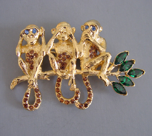 Description TRIFARI Safari Collection Jewels 1996 brooch of three monkeys on a branch.