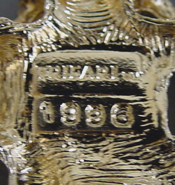 The bodies have brown rhinestones, the leaves green rhinestones and they have blue rhinestone eyes, all in a gold tone setting. Really a fun brooch and it is 2-1/2" by 1-1/2" and signed on the back "Trifari 1996". This is from the Trifari "Safari Collection". View View