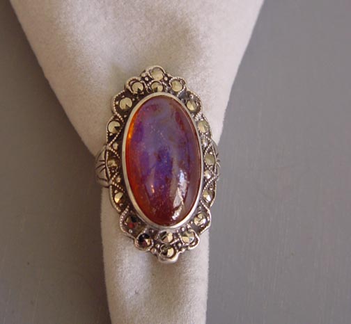 Description UNGER sterling silver ring with Dragon's breath center stone and marcasite accents, smaller size 4-3/4 and 1-1/8" along the finger. Marked inside the band by a "U" with arrow" for the maker Uncas, this is a Fred Harvey style ring and from that era. Dragon's breath is a glass cabochon that is specially treated to give it this particular coloring and rainbow effect, and it is a big favorite of mine. View View Product #40885