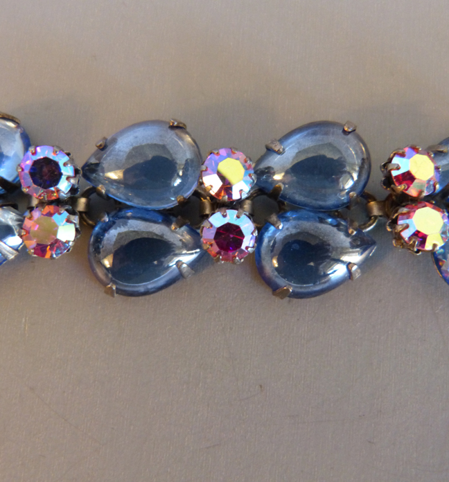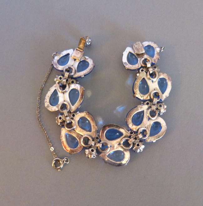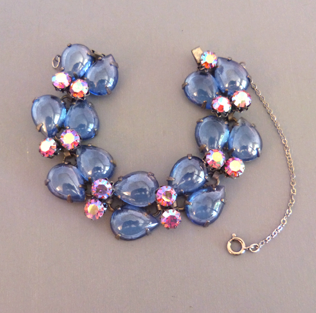 DescriptionVENDOME bracelet with brilliant blue unfoiled cabochons and pink aurora borealis rhinestone accents set in silver tone, 6-5/8" by 1" wide. This is sparkling and in excellent vintage condition, and it still has it's safety chain. Made in the 1960s, it is one of Vendome's best, really spectacular! Coro, Cohen & Rosenberger began making jewelry in the early 1900’s in Providence, Rhode Island. As CORO they are familiar to all costume jewelry lovers. CORO made jewelry from about 1920 until the 1970’s, and probably did it under more different names than any other maker.