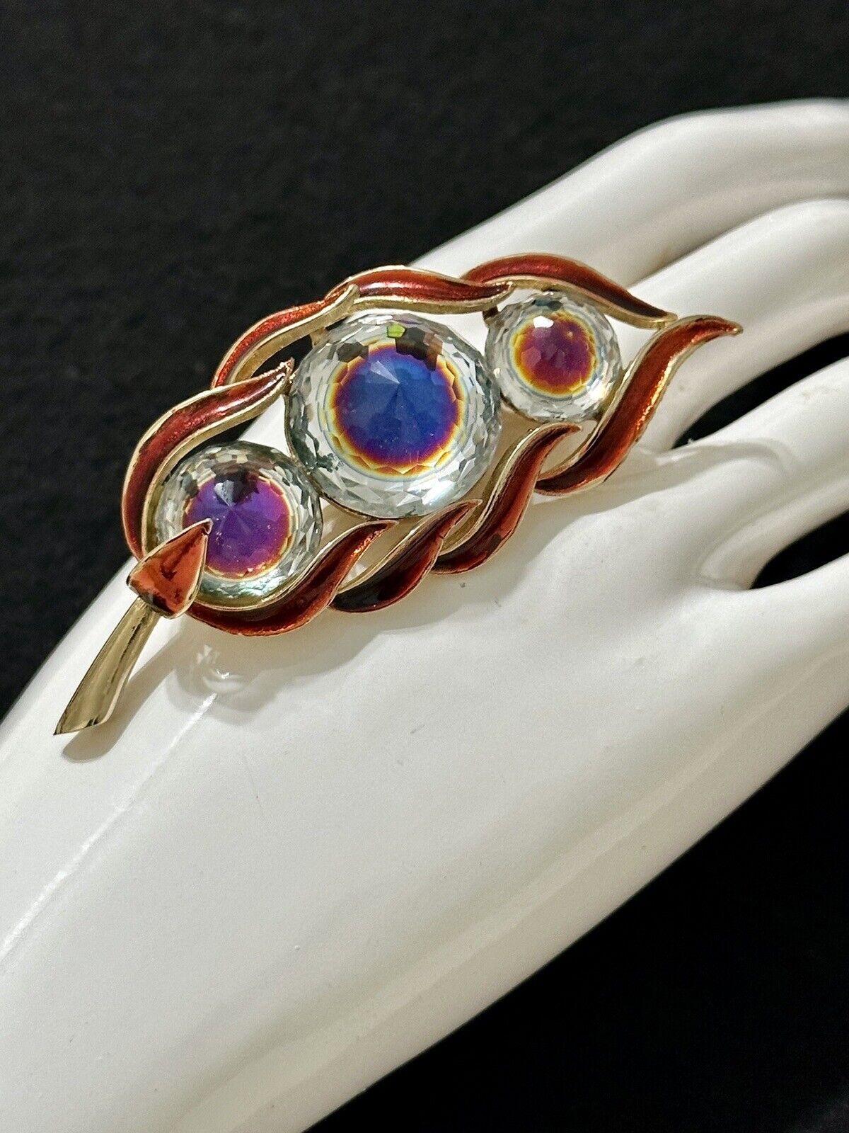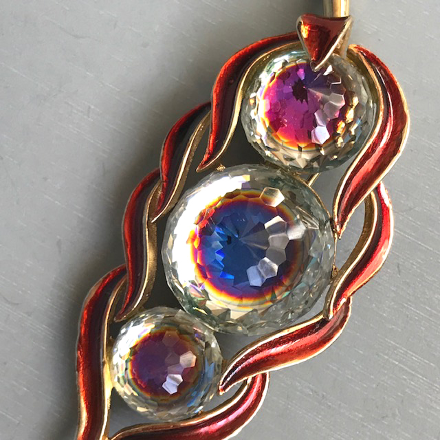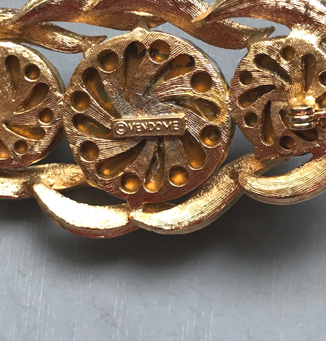 VENDOME rainbow brooch with unusual domed and faceted aurora borealis crystal balls and burgundy colored enamel on a gold plated settingCoro, Cohen & Rosenberger began making jewelry in the early 1900’s in Providence, Rhode Island. As CORO they are familiar to all costume jewelry lovers. CORO made jewelry from about 1920 until the 1970’s, and probably did it under more different names than any other maker. Vendome (1944-1979) , Corocraft (1935-1980), and Duette are just three of many examples. The Coro mark was on the more modestly priced jewelry and Corocraft, Vendome and Francois were the higher priced lines. Gene Verri was one of the best known of their designers, but there were others responsible for the wonderful style of Coro jewelry. View View View Product #42382 All items in excellent vintage condition unless otherwise noted.