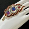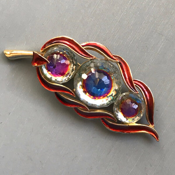 VENDOME rainbow brooch with unusual domed and faceted aurora borealis crystal balls and burgundy colored enamel on a gold plated setting