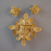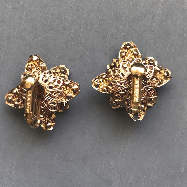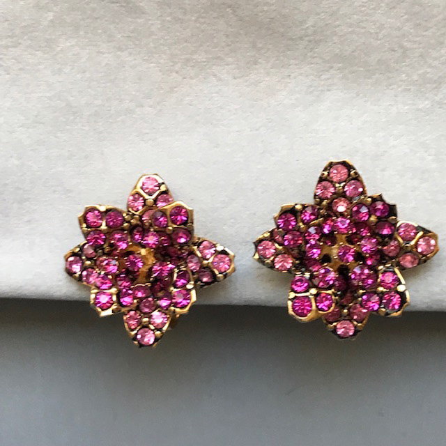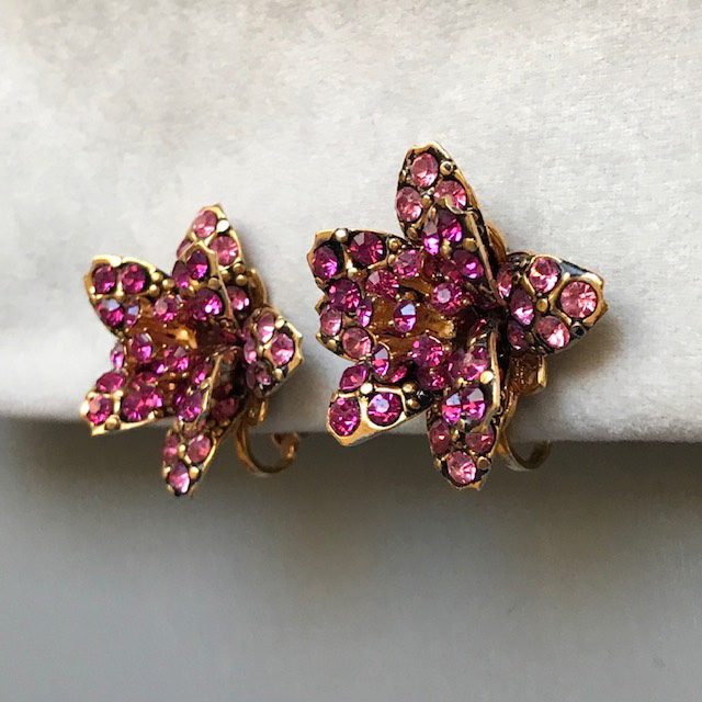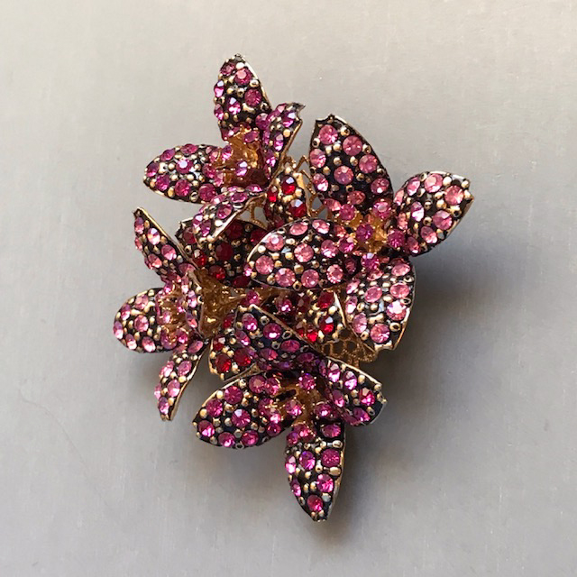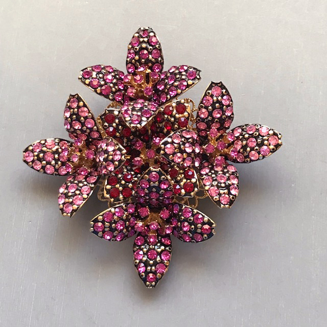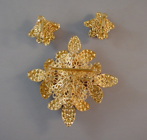 Description VENDOME rare rose and pink rhinestone three-dimensional flower brooch and matching earrings, a large, 3-dimensional and showy set but also light weight and easy to wear.  Each of the four flowers stands above the gold filigree brooch back like a real flower!  The detail is really creative and this is an unusual set that has been in my own collection for decades.  The brooch is 3" by 3" and the clip back earrings 1-1/4",  and the set was probably made in the 1960s.  This may have been from the 1966 Series "Burst of Brilliance" shown in the September issue, but I am not sure.  HERE is the advertisement for that group from Vogue Magazine.
