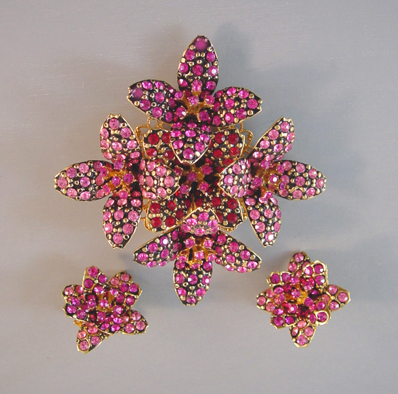 VENDOME rare rose and pink rhinestone three-dimensional flower brooch and matching earrings, a large, 3-dimensional and showy