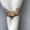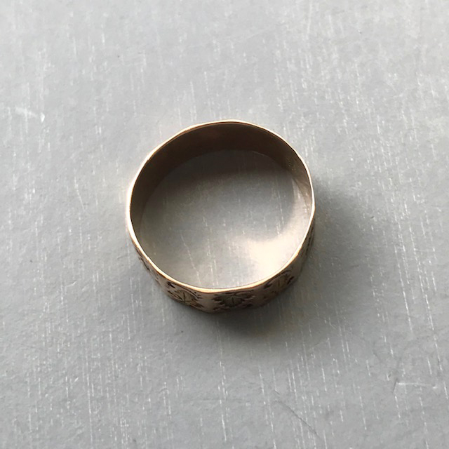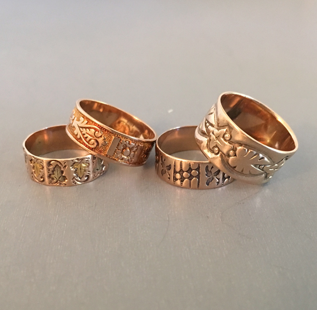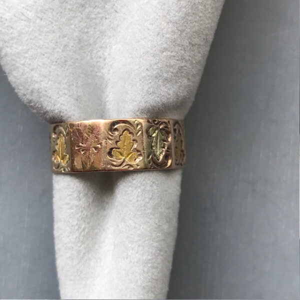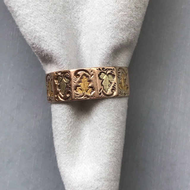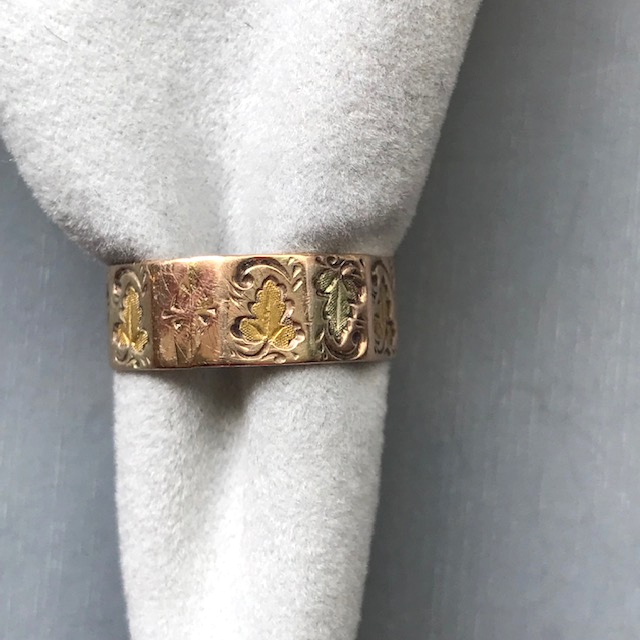 VICTORIAN 10 karat yellow and rose gold wedding or cigar band band ringThis one has twelve smaller flat parts that create the round ring, and each has a leaf and scroll design on it. Size 6-1/2, it weighs .06 ounces. It has one little section where it looks like it may have been resized in the past, so it could be again. The AC Becken Catalogue, 1902 shows a nice selection of these rings, but they were sold in other places back then too. The last photos shows four of these wonderful rings, just for reference. View View View View View Product #37825 All items in excellent vintage condition unless otherwise noted.