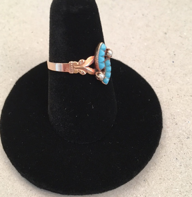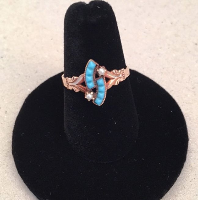 DescriptionVICTORIAN 9 carat and turquoise ring with a yin-yang design accented with two seed pearls. There is one illegible stamped mark inside the band, and this tests as 9 karat gold, size 6-7/8 and runs just shy of 1/2" along the finger, and it weighs a total of .06 ounces. Persian turquoise is a beautiful blue color turquoise with no matrix at all and it was originally mined in Persia. In New Mexico, the Cerrillos mines just south of Santa Fe were also found to have a similar type of turquoise. The story is that this turquoise was used by the Tiffany company in the late 1800s and early 1900s, and it may have even been the source of the lovely aqua color in their advertising.