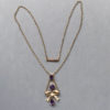 Description VICTORIAN 9 carat yellow gold, natural amethyst and seed pearl pendant necklace. The total length of the pendant portion is 1-1/2" and the wearable length of the chain is 15", with both pendant and chain marked "9ct".