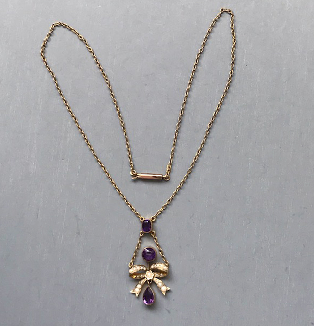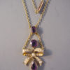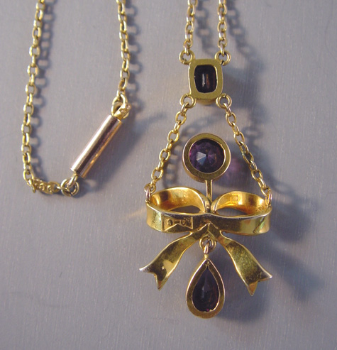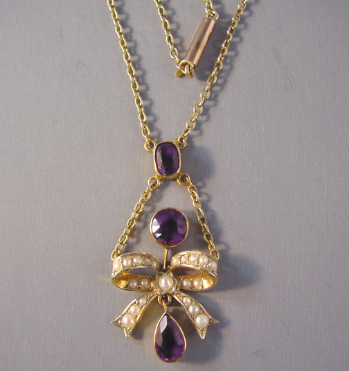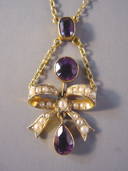 On the pendant the mark is in tiny letters on the back of the bow, and on the chain it's on the chain itself next to the clasp. The pearl bow beautifully emphasizes the amethysts in this wonderful design from about 1900 to 1910. View View Product #36884