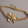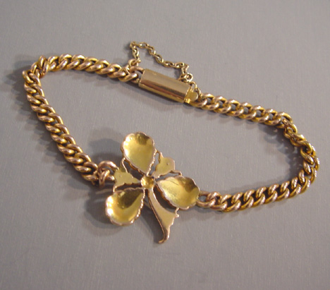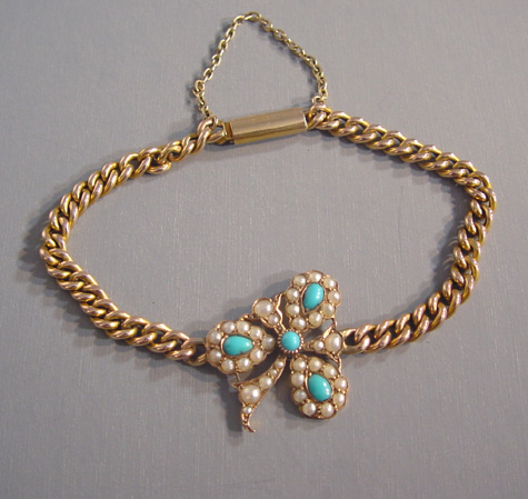 DescriptionVICTORIAN English 9 carat yellow gold, "Persian" turquoise and pearl shamrock or clover bracelet marked on the catch "9c", 6-3/4" long with the clover 1" wide, about .24 ounces, and it has it's safety chain.
