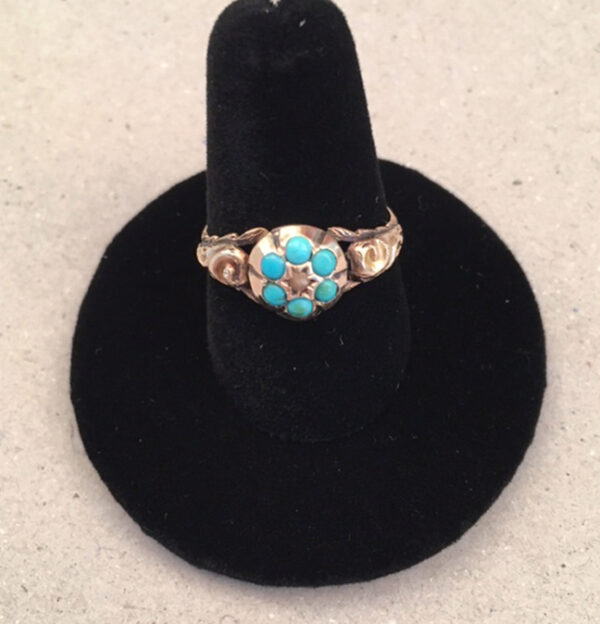 DescriptionVICTORIAN antique turquoise and pearl ring in a 9 carat yellow gold setting with 6 turquoises surrounding a single tiny natural pearl. The shoulders are nicely decorated with embossed designs with textures leaves on each side. It is hallmarked on the inside with "FW 9 375" with the anchor mark and the date letter "Z". It is a size 8-1/2 and it weighs .06 ozs.