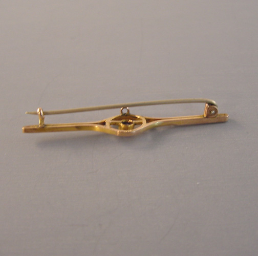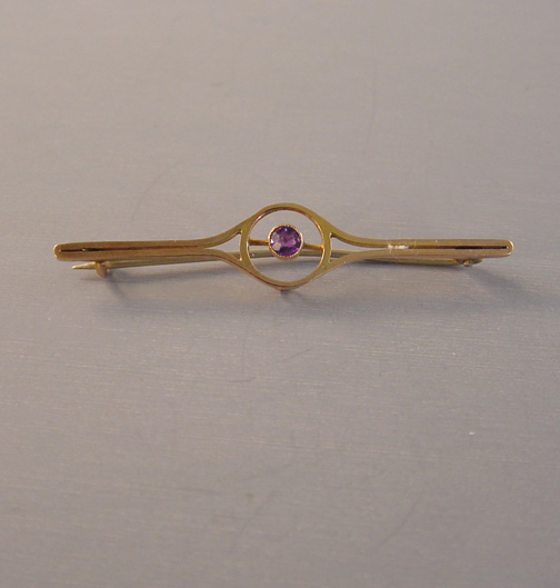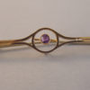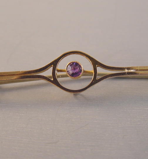 DescriptionVICTORIAN 9 karat yellow gold bar pin with faceted tiny amethyst, marked on the back 9ct, loop for a safety chain, circa 1900, 2". This is in excellent condition.