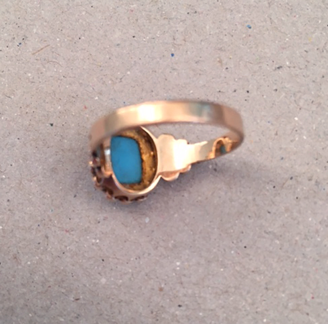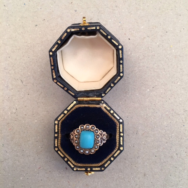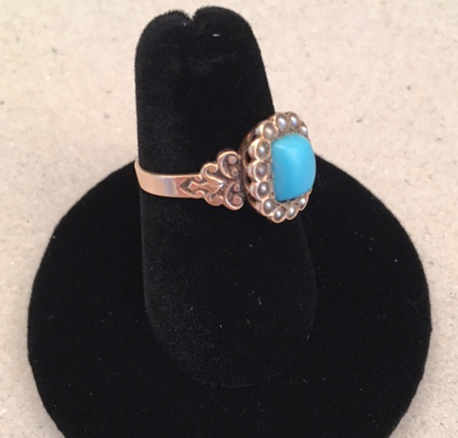 VICTORIAN antique 10k turquoise ring with tiny seed pearls set around a cushion-shaped turquoise, beautifully decorated sidePersian turquoise is a beautiful blue color turquoise with no matrix at all and it was originally mined in Persia and then brought to Europe. In New Mexico, the Cerrillos mines just south of Santa Fe were also found to have a similar type of turquoise. The story is that this turquoise was used by the Tiffany company in the late 1800s and early 1900s, and it may have even been the source of the lovely aqua color in their advertising. The turquoise used in Victorian jewelry has an interesting history, and to read more about it, click HERE. View View View Product #39815 All items in excellent vintage condition unless otherwise noted.