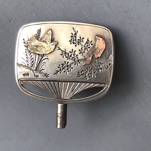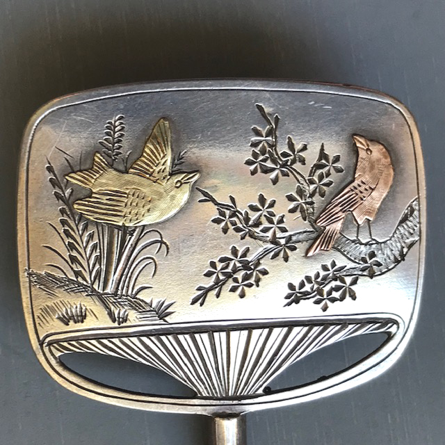 Description VICTORIAN rare antique birds locket brooch in sterling silver with and rose and yellow gold birds sitting on etched flowered branches with ferns and grasses on the front. The Victorians were enchanted with nature and natural themes and this is a wonderful example of that passion. On the back is a locket with a clear cover for a photo or a lock of hair. This charming pin belonged to my friend who collects antique fan jewelry of all kinds. This is from the 1880s, it is 1-1/3" by 1-1/2" and the total weight is about .28 ounces.