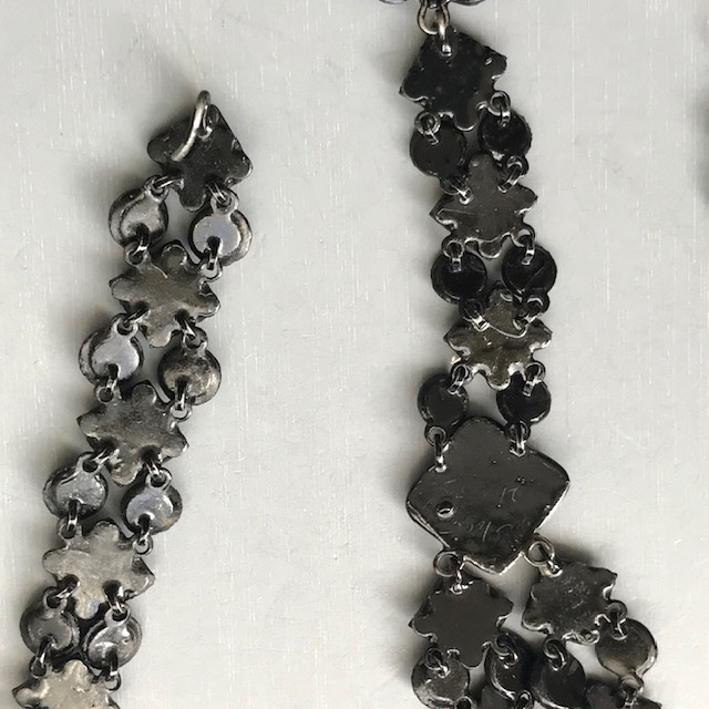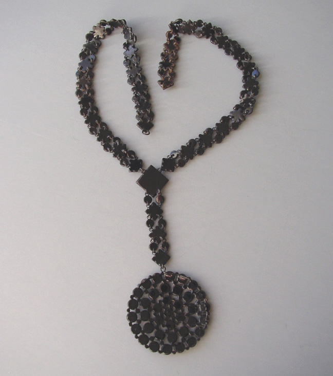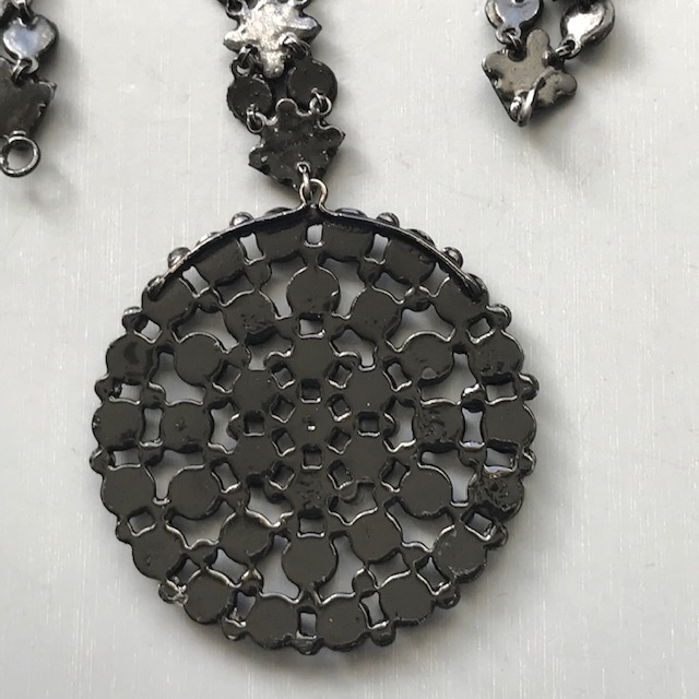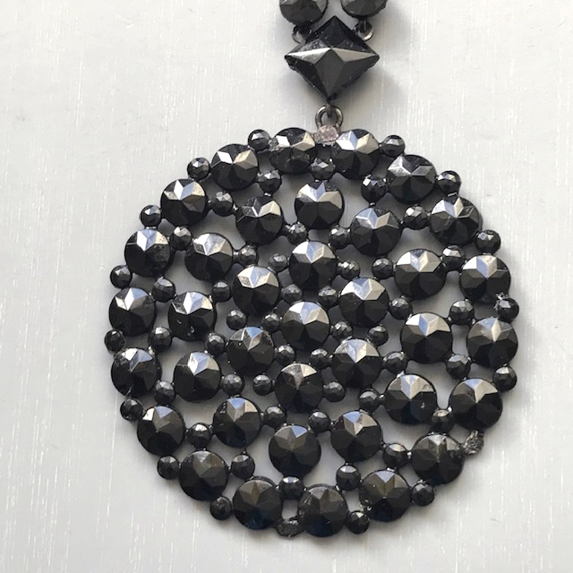 Description VICTORIAN antique French jet pendant necklace from the late 1800s.  It is 18" wearable length with a 2-5/8" drop and a 2" round pendant.  This is missing 3 tiny black flatbacks and there are signs of wear here and there with very tiny flea bites and scuffing, all visible with magnification.  French jet is black glass on a black enameled metal backing and it was used in the late Victorian era to emulate Whitby jet.  It is usually more shiny and the pieces can be smaller and much more delicate than jet, and they can be much more intricate in their designs as well.