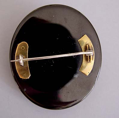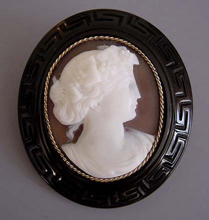 VICTORIAN antique hand carved Whitby jet and and sea shell cameo brooch with a Greek key design around the edgeProduct #29821 All items in excellent vintage condition unless otherwise noted.