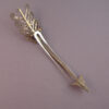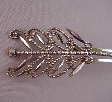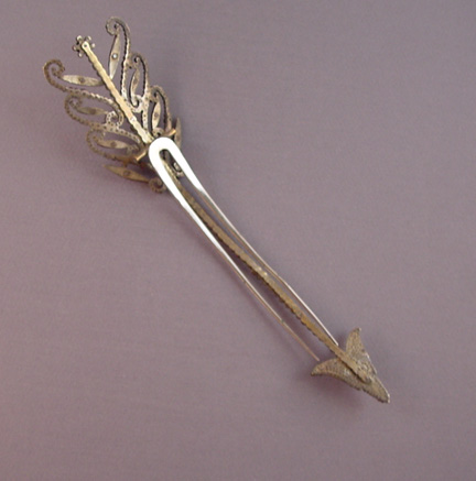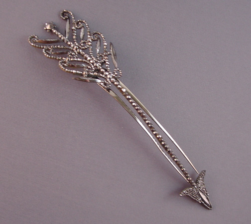 VICTORIAN antique large cut steel arrow clip with hand cut two prong fastenerBecause the prongs are fairly wide, this can only be worn on a sweater or cloth with a very open weave. Each prong is 1/8" wide at the top, just to give you an idea of the fabric it could work on. View View Product #36091 All items in excellent vintage condition unless otherwise noted.