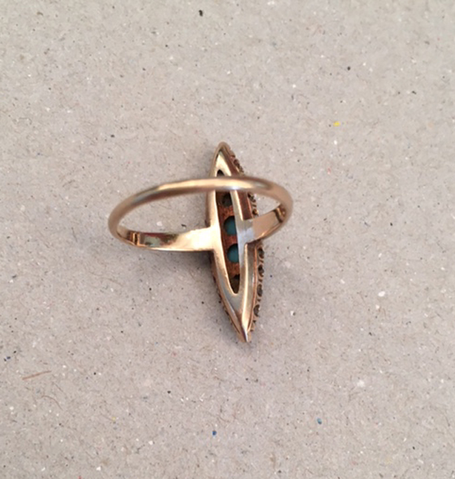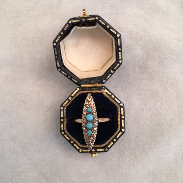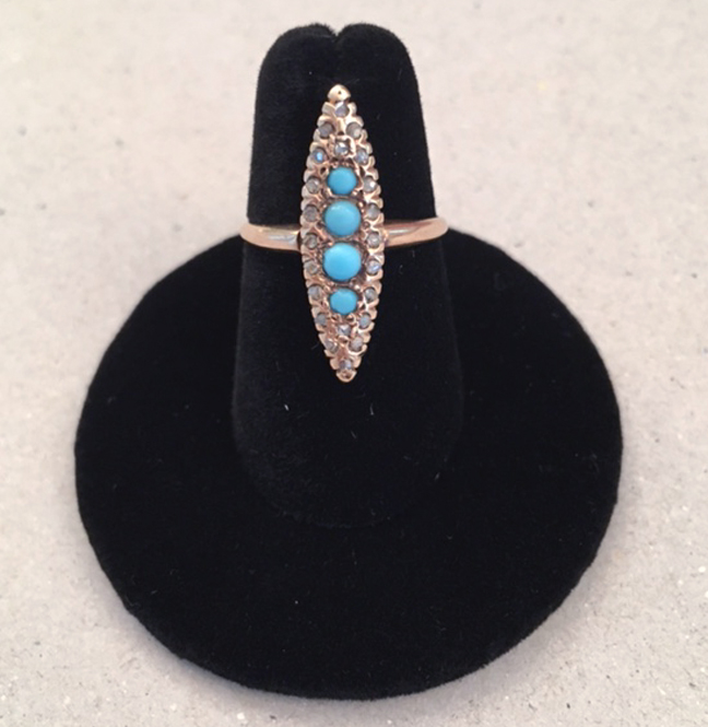 VICTORIAN antique ring with rose cut diamonds and Persian turquoise in an elongated shapeThere are 22 rose cut diamonds of about .15 total carat weight and they add a nice sparkle to the ring. The turquoise used in Victorian jewelry has an interesting history, and if you would enjoy reading more about it, click HERE. View View View Product #39813 All items in excellent vintage condition unless otherwise noted.