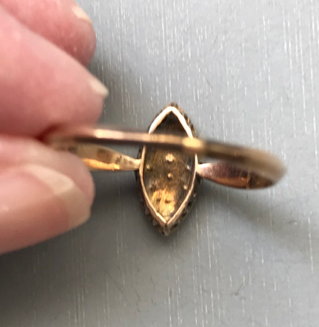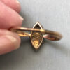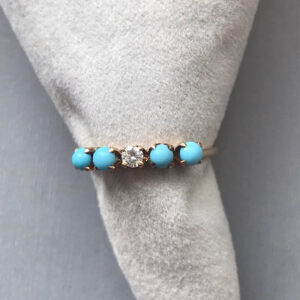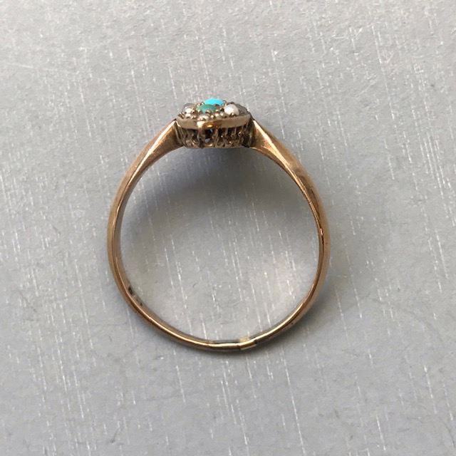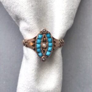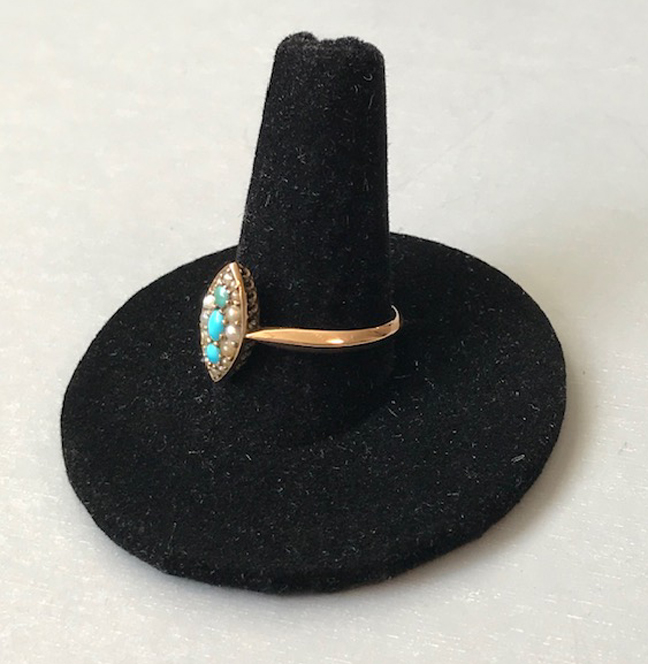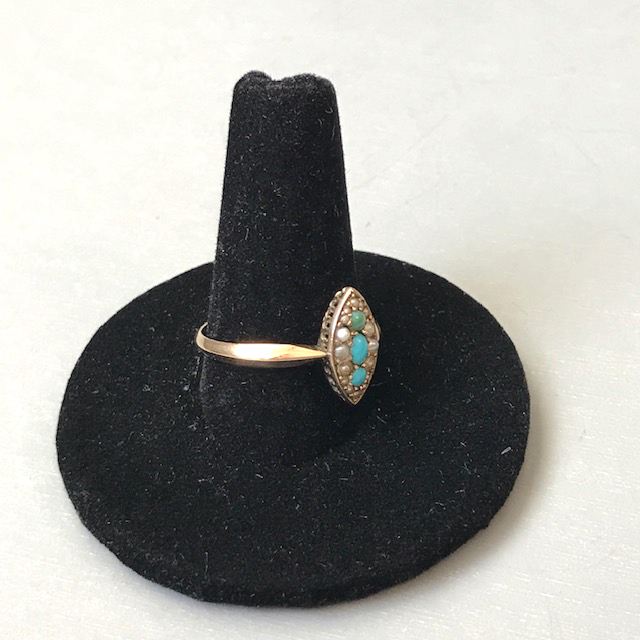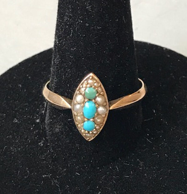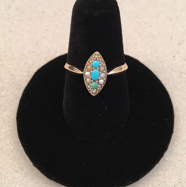VICTORIAN antique turquoise ring in a marquis shape with three turquoises surrounded by seed pearlsThis type of turquoise is often called Persian turquoise, a generic name because it probably did not come from Persia. It is a beautiful blue colored turquoise with no matrix at all, and in New Mexico, the Cerrillos mines just south of Santa Fe were also found to have a similar type of turquoise. It is interesting to know that the Cerrillos turquoise was used by Tiffany at the turn of the last century and that a parure of turquoise and diamonds were in a wedding gift from King George VI to Elizabeth. The turquoise used in Victorian jewelry has an interesting history, and if you would enjoy reading more about it, click HERE. The last photo shows other examples of the Victorian turquoise rings, for sale elsewhere on this site. View View View View View Product #39820 All items in excellent vintage condition unless otherwise noted.