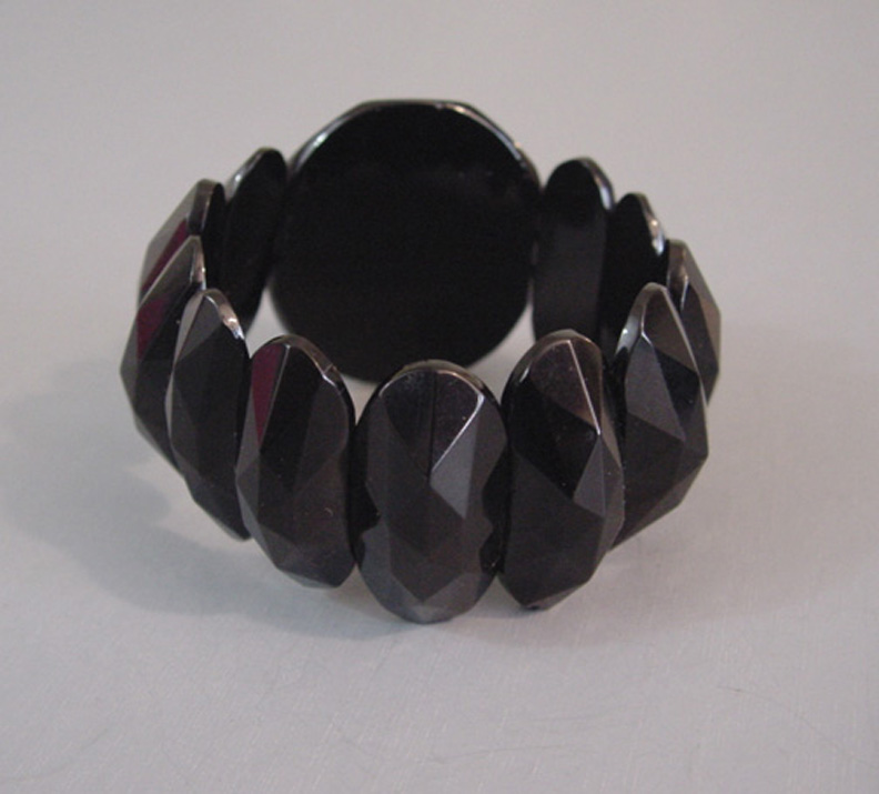 Description VICTORIAN antique Whitby jet bracelet and brooch set with Tyrolean or gypsy boy portrait on the front. The bracelet is strung on elastic, as it was originally when it was made, and the links are faceted. It is 6" relaxed size and stretches to about 6-1/2" with a 1-1/2" width at the front and 1-1/8" back. The brooch is 2-1/2" by 1-3/4". The set is in very good condition for it's age with only a few very tiny flea bites here and there in the jet, each smaller than a lead pencil tip. Green boy pieces like this were popular circa 1870.