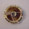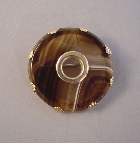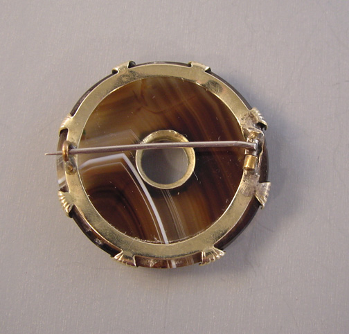 Description VICTORIAN banded agate brooch in chocolate, caramel and cream colors set in gold tone metal, 1-5/8" wide.