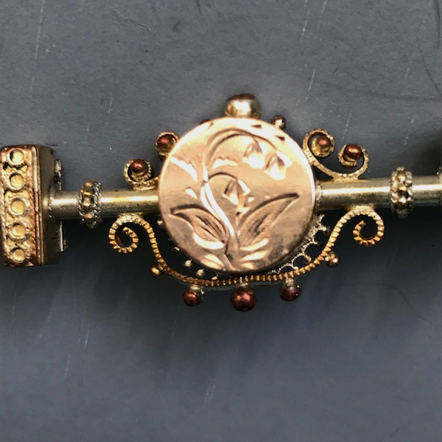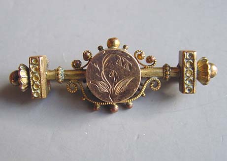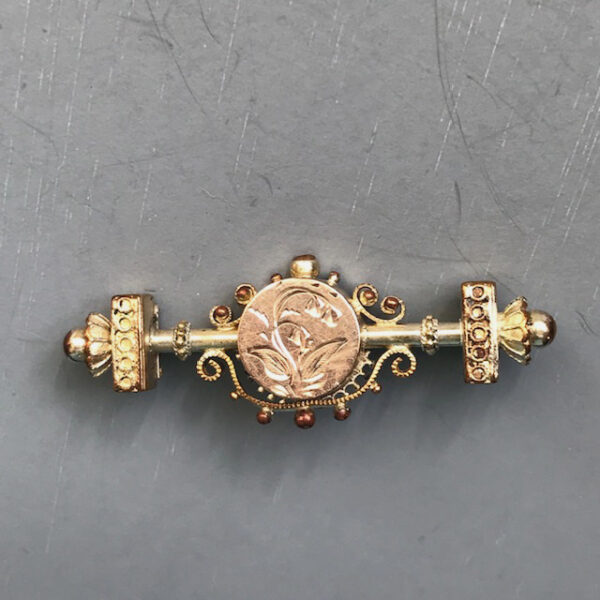 VICTORIAN gold tone bar pin with etched lily-of-the-valley flower center